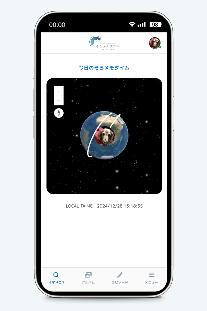 写真やメッセージを空(宇宙)へ届けるだけでなく、ご家族とペットの現在地を確認したり、記念日の通知を受け取ったり、アルバムを共有して想いを交わすことができます。